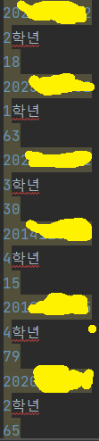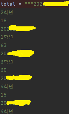 파이참에 복사 붙여넣기를 해보니 위 사진처럼 학년-점수-학번 순서로 연속해서 쓰였다. 나는 이 중 점수들만 뽑아서 써야하기 때문에 위 정보를 문자열로 저장한 이후 split 함수를 통해 리스트에 저장했다.