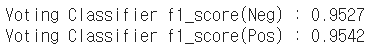 이번엔 모델의 성능을 좀 더 올리기 위해 로지스틱 회귀, Knn, 랜덤포레스트, ADA 모델을 하드 보팅 형식으로 앙상블한 모델을 만든 이후 negative와 positive일 때의 f1-score를 출력했다.