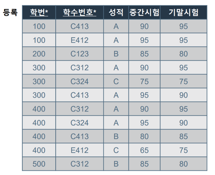 4. ‘Database’ 과목을 등록하여, 성적 ‘A’를 받은 학생의 이름을 검색하세요.