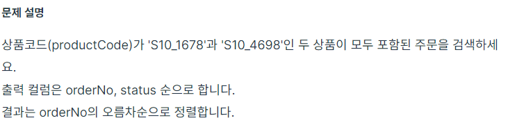 productCode가 두 개의 값 모두인 주문을 찾으려면, 해당 주문의 상세 내역에서 productCode가 두 개의 값 중 하나씩 포함되는지 확인해야 하지만, 내 코드에서 서브쿼리의 WHERE 절이 제대로 작동하고 있지 않은것이다.