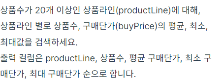 포인트는 proudctLine컬럼을 기준으로 group by를 할 때, HVING 절을 활용해 상품수가 20개인 productLine만을 선택해야 하는 것이다.