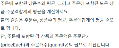 위 문제는 집계함수를 활용해 여러 값들을 출력하는 문제인데, 주문 별로 GROUP BY한 이후 집계함수를 적용한다면 상품수의 평균은 count() 함수와 AVG()함수를 함께 사용해야 하고, 주문액합계의 평균은 SUM()과 AVG()함수를 함께 사용해야 한다. 이때, 하나의 테이블에서 두개의 집계함수를 모두 사용한다면, 에러가 발생한다.