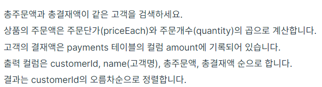 처음 이 문제를 시도할 때는 네 개의 테이블을 모두 조인한 후 한꺼번에 계산을 하려 했으나, 총 주문액과 총 결재액이 전혀 다른 계산이다 보니 그렇게 할 수가 없었다. 이에 필요한 네개의 테이블들중 총 주문액과 총 결재액을 구할 수 있는 두 개의 테이블로 각각 나누어 임시 테이블을 만들어 주었고, 이 두 임시테이블을 조인하기 위해서 공통 칼럼인 customer Id까지 넣어주었다. 각각의 임시테이블에서 원하는 값을 구한 뒤, 조인을 통해 두 테이블을 합쳐서 원하는 결과를 얻을 수 있었다.