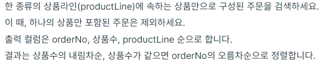 예제 2에서 포인트는 '한 종류의 상품라인에 속하는 상품만으로 구성된 주문을 검색하세요.'이 부분을 보고 어떤 칼럼을 기준으로 GROUP BY할지 정해주는 것이다. 이에 orderNo(상품번호)별로 GROUP BY를 하고 그에 대한 상품라인을 count한다면, 해당 조건을 쉽게 처리할 수 있다. WHERE 절 조인은 여러 테이블에 저장되어 있는 연결된 칼럼을 조건에서 활용하고 싶을 때 쓸 수 있다.