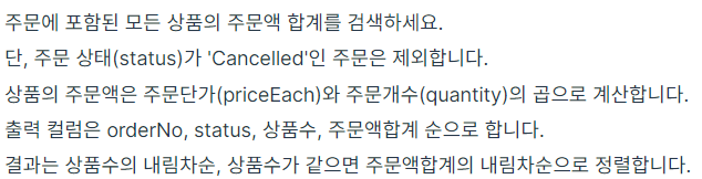 SELECT o.orderNo, o.status, count(d.orderNo) '상품수', sum(d.priceEach*d.quantity)