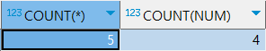 count(NUM)은 'NUM컬럼'에 대해 집계함수로서 적용되는 것이기에 NUM칼럼상에서 NULL로 저장된 값은 다른 집계함수와 마찬가지로 무시하고 집계한다.