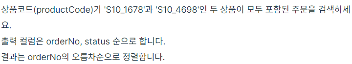 만족하는 productCode가 's10_1678'과 's10_4698'이기에 orderDetails 컬럼 자기 자신을 조인했다. 하나의 테이블에서 두가지 조건을 사용하고 싶으면 이런 방법을 사용할수 있다.