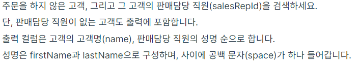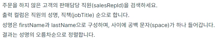 WHERE절을 이중으로 사용하였다. 우선 orders 테이블에서 존재하는 모든 customerId를 빼낸 이후 여기에 존재하지 않는 salesRepId를 뽑아냈다. 서브쿼리에서 나온 salesRepId 데이터중 employeeId가 포함되는 즉, 주문을 하지 않은 고객의 판매담당 직원 아이디를 뽑아낼수 있었다.