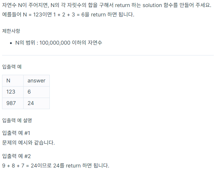 [PYTHON] 파이썬 프로그래머스 문제 풀기 1 - 자릿수 더하기