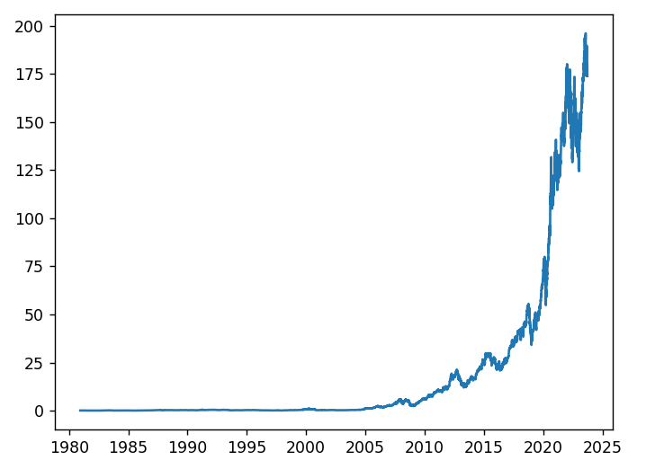 기간을 정하지 않으면 80년도부터 현재까지 애플의 데이터를 받아올 수 있다. 여기서 matplotlib패키지를 활용하여 수정 종가 그래프를 그릴 수 있다.
