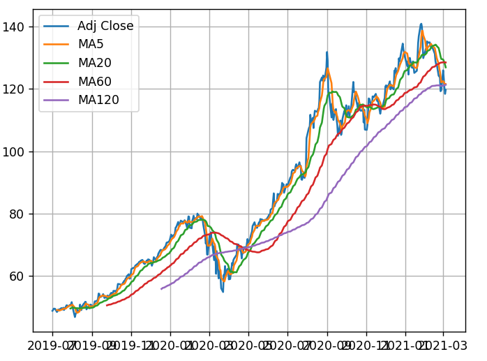 주식의 기술적 분석에서는 5일 이평선, 20일 이평선, 60일 이평선 등 많은 이평선들이 교차하는 지점을 중요한 매매 타이밍으로 보고 있다. 그래서 기존에 volumn이 0 이 아닌 데이터들로 만든 새로운 데이터프레임에 각 이평선 값들을 구해 새로운 컬럼으로 대입해서 분석하려고 한다.