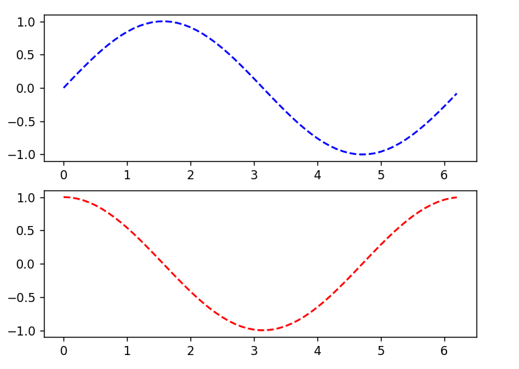numpy를 통해 사인과 코사인값을 구할 수 있다. x값에 0부터 파이까지(사인, 코사인 함수의 한 주기)의 값을 0.1 간격으로 저장하고, 이 값들에 대한 사인 코사인값들을 표현하는 그래프를 1행과 2행에 각각 출력한다.