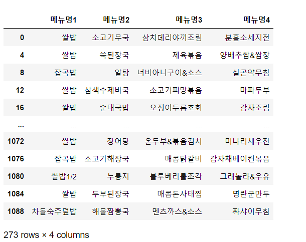 selected_columns1 = ['식이구분','메뉴명1', '메뉴명2', '메뉴명3', '메뉴명4'] # 이 부분은 실제 데이터프레임의 컬럼명에 맞게 수정해야 합니다.