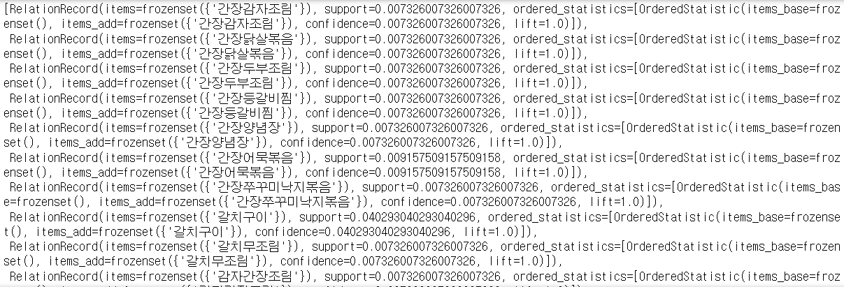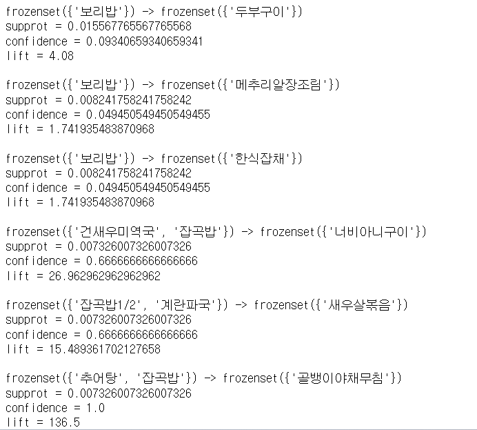 마지막으로 만들어진 연관규칙중 아까 생성해 놓은 조건(메뉴명1, 메뉴명2 --> 메뉴명3, 메뉴명4)을 만족하는 규칙들을 선택해준다.