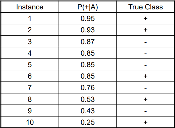 위 표에서 만약 cut-off value를 0.86으로 잡는다고 하면 P값이 0.86보다 큰 값을 Positive로 예측한다는 뜻이다. 이러한 경우에는 TP 값은 1, 2 instance에 의해 2개가 되고, FP 값은 3 instance에 의해 1개가 된다. P값이 0.86보다 작은 값들은 Negative로 예측하므로, TN 값은 4개 FN 값은 3개로 Confusion Matrix를 정의할 수 있다. 즉, Cut-off value를 어떻게 설정하는지에 따라 Confusion Matrix가 다르게 정의 되는 것을 확인할 수 있다.